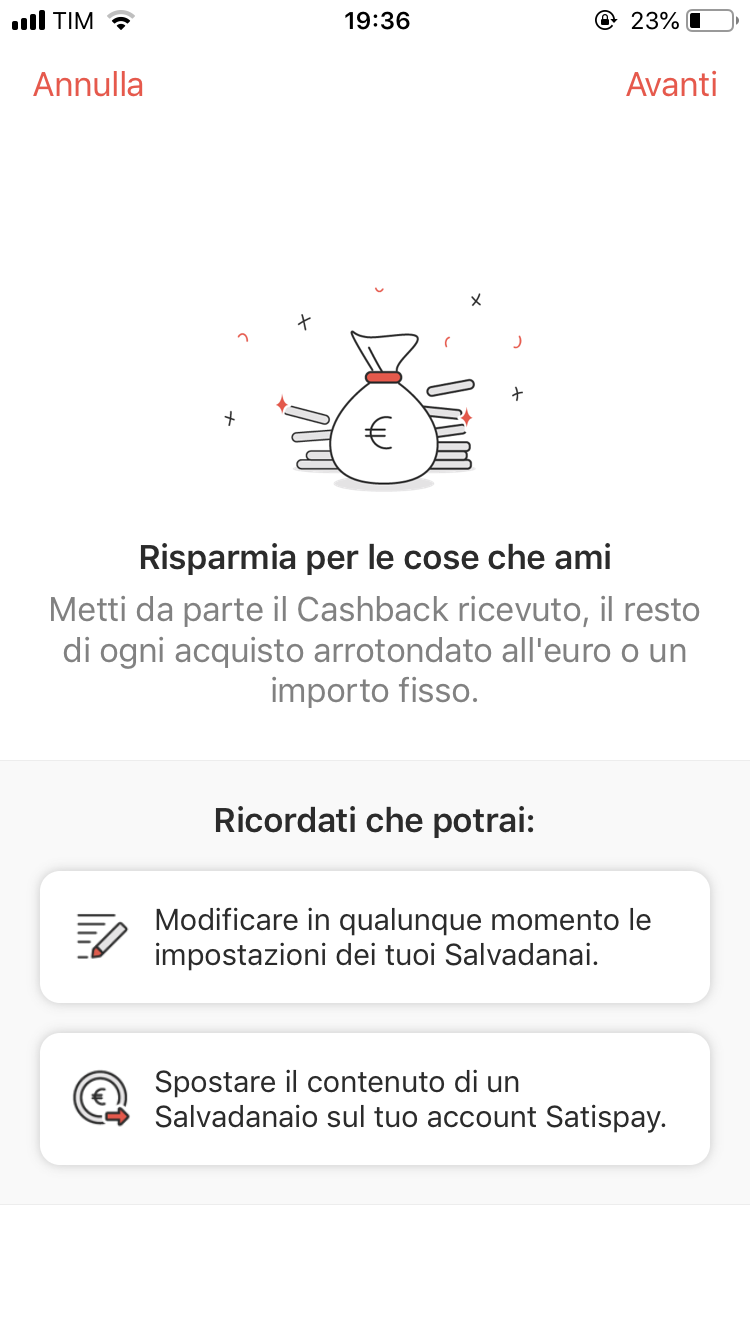 Entrambe le opzioni sono le relativamente più recenti. La funzione salvadanaio, sotto la voce “Risparmi” fa si che tu possa accumulare il Cashback ricevuto o l’arrotondamento del resto di ogni acquisto effettuato, cosicché tu possa ad un certo punto trovare un tesoretto nascosto alla fine di un periodo stabilito. Inutile stare qui ad elencare i facilmente intuibili motivi per cui io non abbia ancora attivato l’opzione, ma in realtà in qualsiasi momento sei libero di ritrasferire tutto quanto accumulato di nuovo sul tuo conto Satispay.
