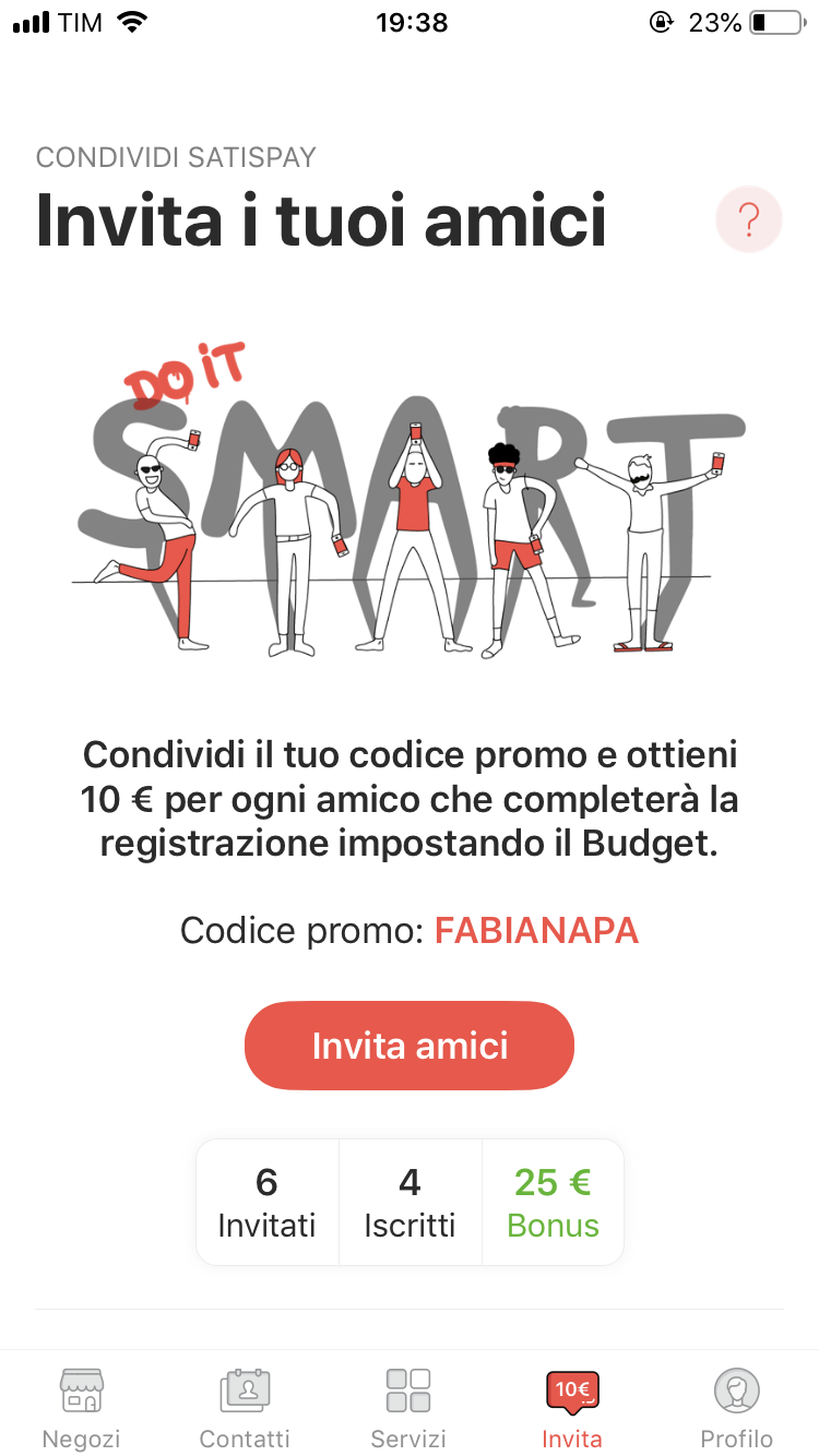 Do it smart! La campagna di Satispay suona così. Satispay, infatti, ti da la possibilità di ottenere con il tuo personalissimo codice sconto 10€ per ogni nuovo utente che deciderà di iscriversi ed impostare il budget per la prima volta. Il sistema di rewarding è piuttosto efficace ed invitante, lo devo ammettere, e soprattutto quanto è bello esordire con “vuoi il mio codice sconto?” che Ferragni levate. Fino ad adesso quattro amici si sono iscritti a Satispay con il mio codice e ho all’attivo tre esercizi commerciali che si sono piegati alla mia evangelizzazione.